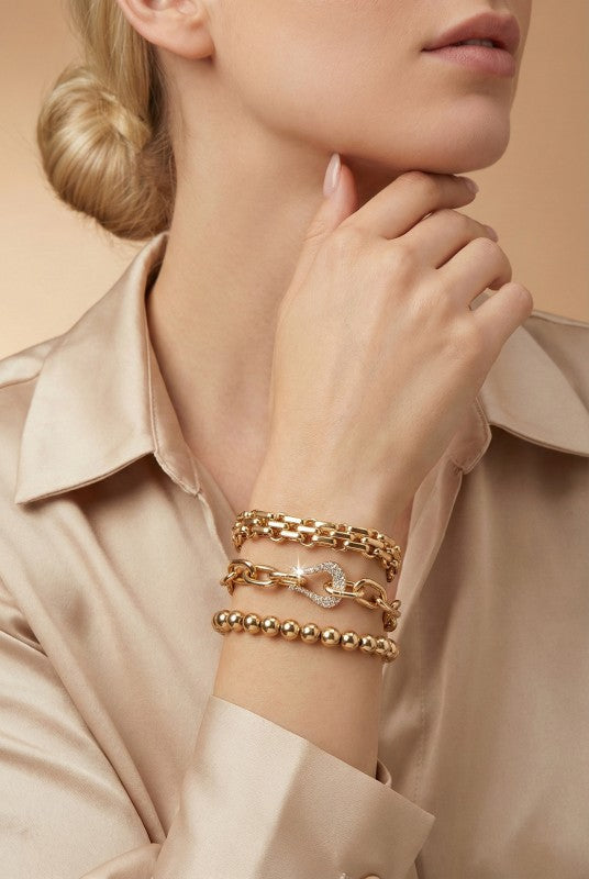 A radiant 3-piece bracelet set designed to elevate everyday styling with a refined modern touch. The set features a polished gold bead strand, paired with 2 distinct chain styles that add depth and dimension. A pave buckle-shaped charm brings a hint of sparkle, creating a balanced look that is both chic and versatile.