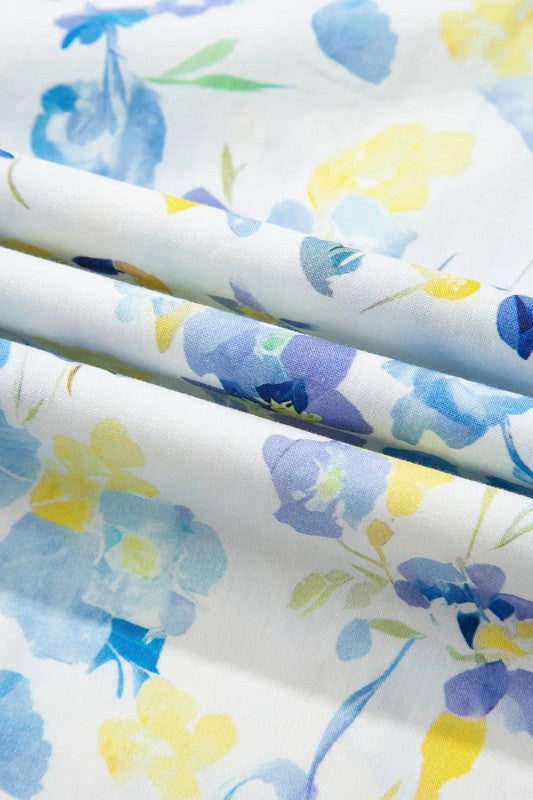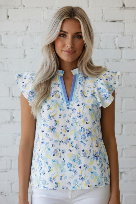 Bloom in style with this sky floral blouse that captures effortless charm. Delicate frills dance along the edges for a flirty, fun vibe, while the notched V-neck gracefully frames your collarbones. Crafted from lightweight fabric, it's perfect for staying cool and comfortable all day long. Whether you're dressing up for a special occasion or keeping it casual, this romantic print brings personality to any wardrobe. Cotton/Viscose
