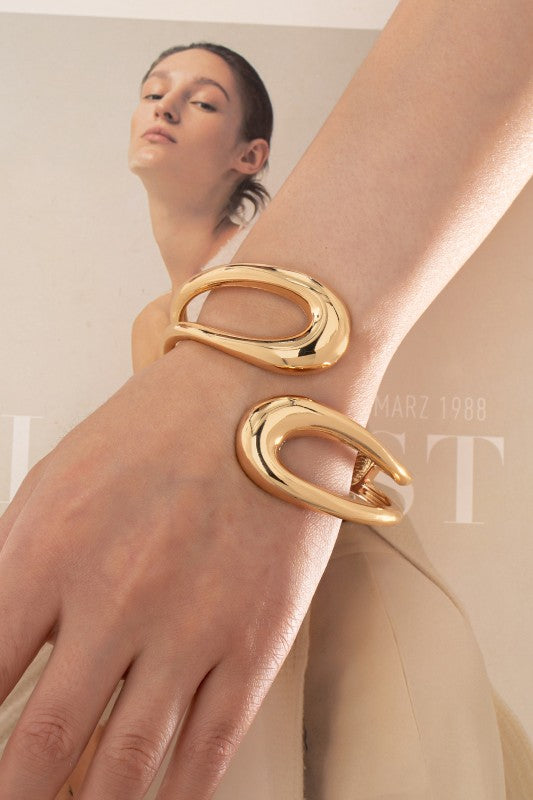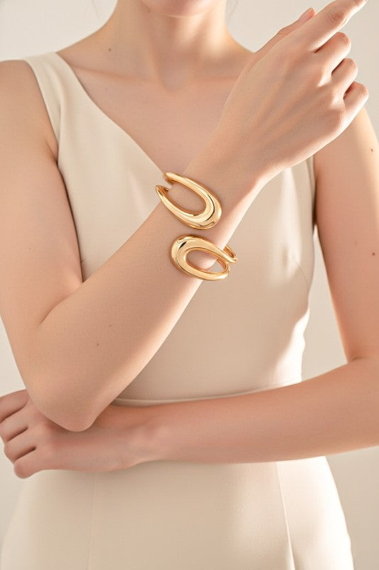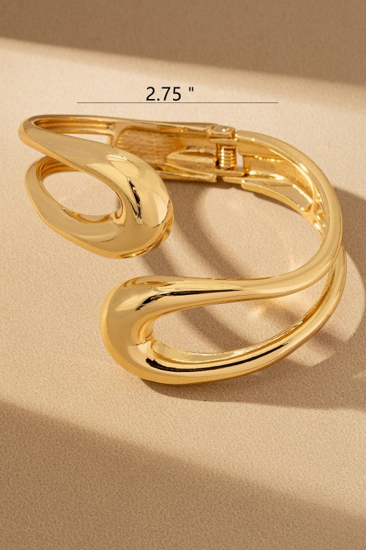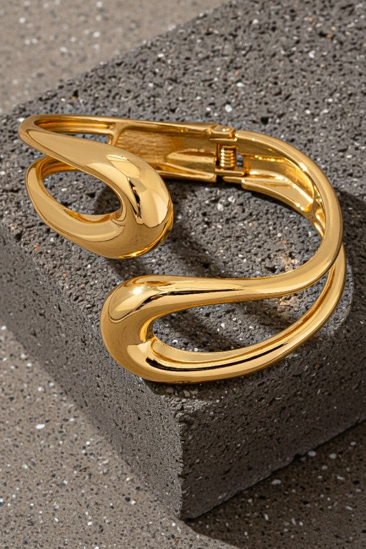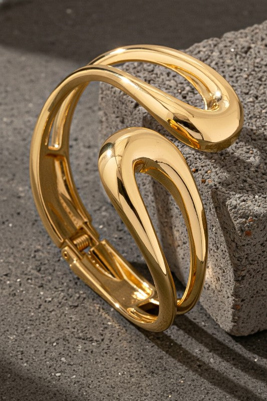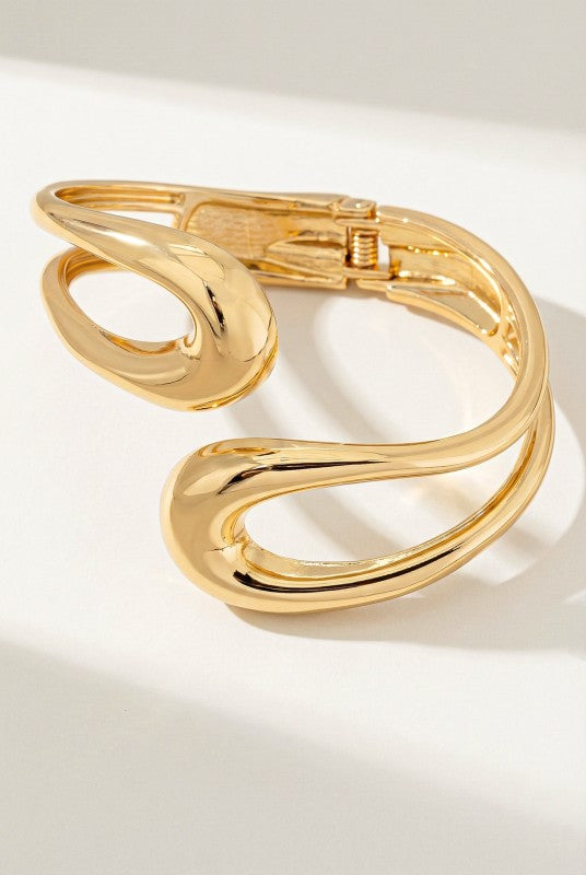 Sculptural open-form gold bangle with a fluid, organic silhouette and mirror-polished finish. Its bold curves and negative-space design create a modern statement while maintaining timeless elegance. The hinged closure ensures a comfortable and secure fit.
